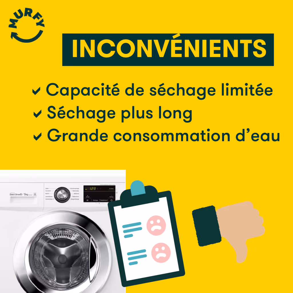 Enfin, le lave-linge séchant consomme une grande quantité d’eau, ce qui n’est pas l’idéal (ni pour la planète, ni pour votre porte monnaie). À l'inverse d’un sèche-linge traditionnel qui utilise de l’air, une lavante séchante utilise de l’eau pour refroidir l’air chaud et humide provenant du tambour.