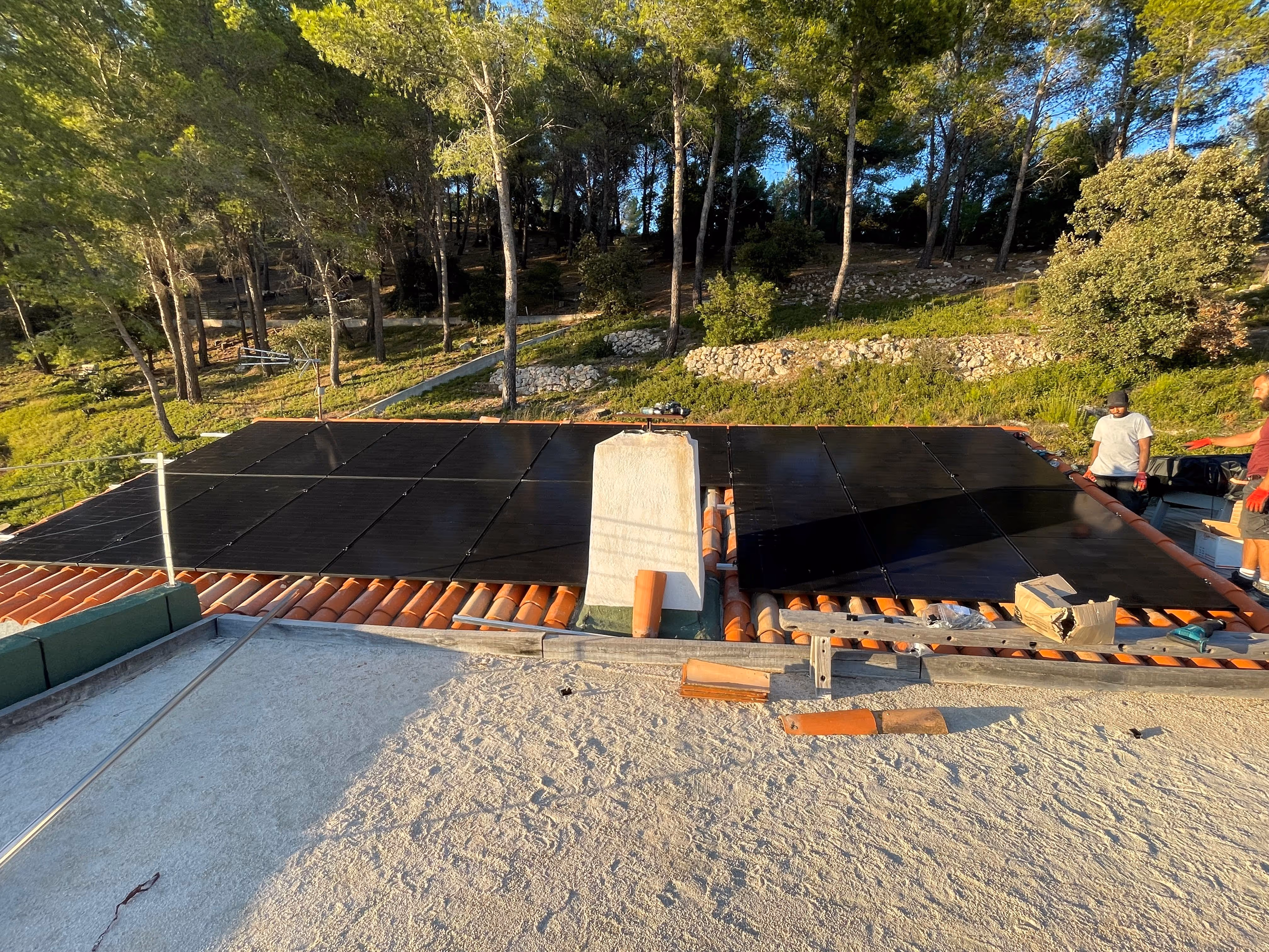Pour cette installation de 8,5 kWc, les 17 panneaux ont été posés en surimposition sur un pan unique orienté plein sud, avec une inclinaison naturelle de 25°. Ce qui fait la particularité de ce chantier, c’est le terrain de pétanque clair situé juste devant la toiture : grâce à l’effet d’albédo, la réverbération de la lumière améliore sensiblement le rendement des panneaux, notamment en début et fin de journée. Couplés à des micro-onduleurs, les modules tirent pleinement parti de cette luminosité indirecte. Une configuration simple mais très performante, qui allie efficacité et bon sens terrain.